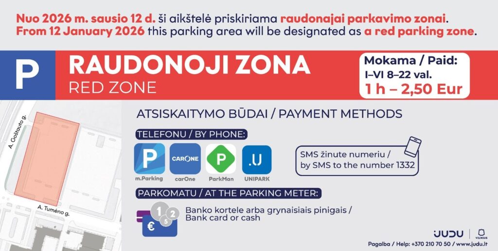Nuo 2026 m. sausio 12 d. atvira (be užtvarų) automobilių stovėjimo aikštelė, esanti šalia Lietuvos Respublikos Seimo, tampa mokama. Šioje aikštelėje bus taikoma Raudonosios zonos rinkliava: 2,5 Eur/val., mokama I–VI, 8:00–22:00. Aikštelė talpina 187 automobilius. Artimiausio pastato adresas: A. Tumėno g. 4.