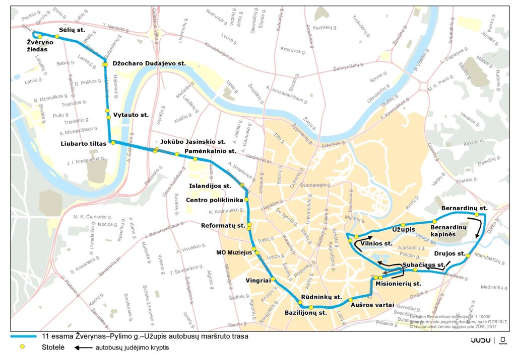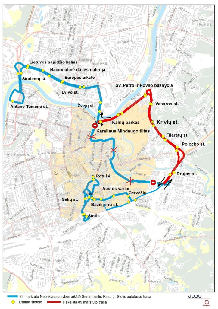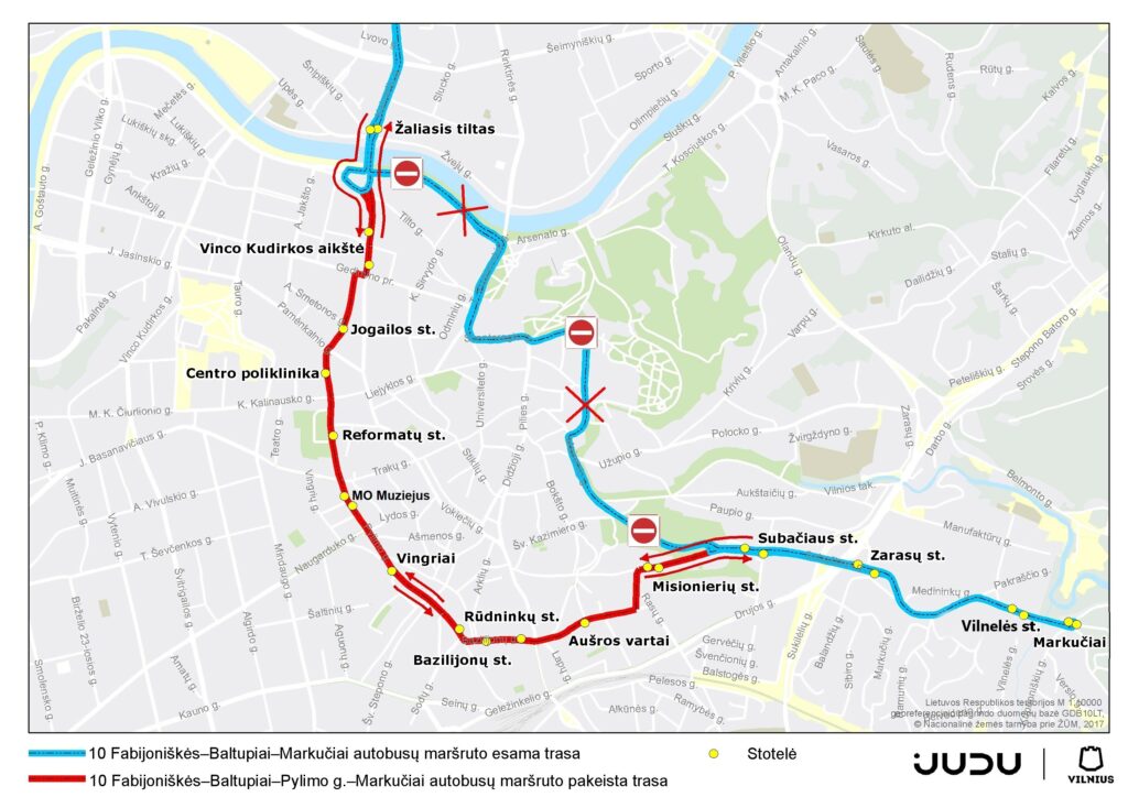Dėl vykdomų darbų ir laikinai įvedamų eismo ribojimų, 10, 11, 33 ir 89 maršrutų autobusai abiem kryptimis kursuos apylankomis. Laikinai nebus aptarnaujamos stotelės Arkikatedra, Bernardinų sodas, Dailės akademija ir Užupio st. Tvarkaraščius ir pasikeitusių viešojo transporto maršrutų trasas galima rasti svetainėse judu.lt ir stops.lt, viešąjį transportą realiu laiku galima sekti JUDU virtualioje švieslentėje: https://judu.lt/viesojo-transporto-keleiviams/virtuali-svieslente/.