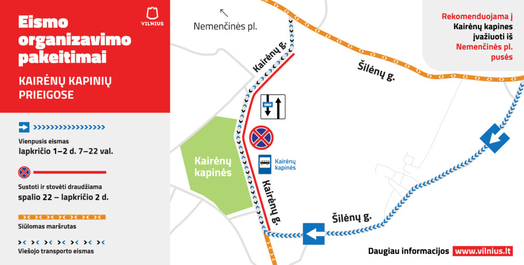 Vengiant didelių spūsčių susidarymo, į Kairėnų kapines rekomenduojama važiuoti nuo Nemenčinės plento pusės. Iš Kairėnų gatvės transporto priemonės bus kreipiamos apylanka per Šilėnų gatve. Atkarpoje ties Kairėnų kapinėmis eismas vyks viena kryptimi (į šiaurę), sudarant galimybę pravažiuoti maršrutiniams autobusams.