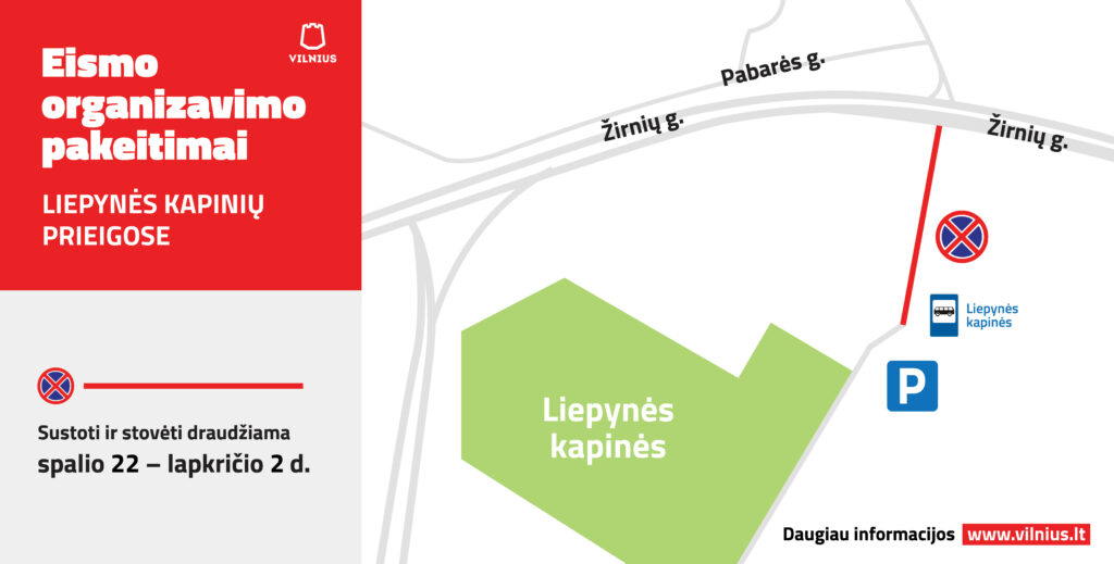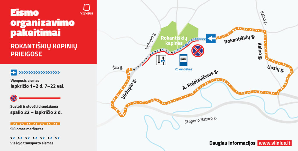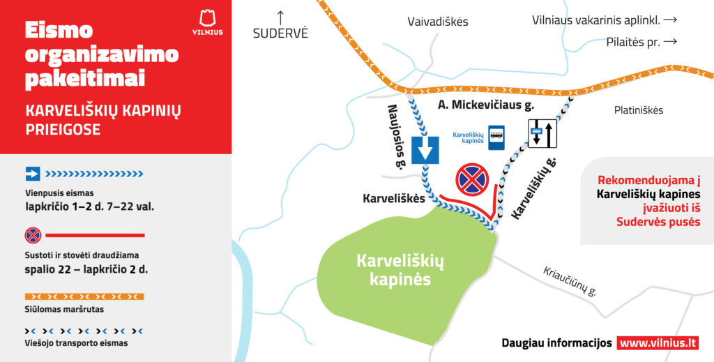 Nuo spalio 22 d., trečiadienio, iki lapkričio 2 d., sekmadienio, Rokantiškių, Karveliškių, Kairėnų ir Saltoniškių kapinių prieigose šalia autobusų, apsisukimo žiedų, kapinių įėjimo vartų automobiliams bus draudžiama sustoti ir/ar stovėti.