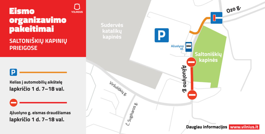 Lapkričio 1 d. Ąžuolyno gatvėje, ties Saltoniškių kapinėmis, bus draudžiamas transporto eismas, išskyrus viešojo transporto eismą. Įvažiuoti į šalia kapinių esančią stovėjimo aikštelę bus galima tik iš Ozo gatvės.