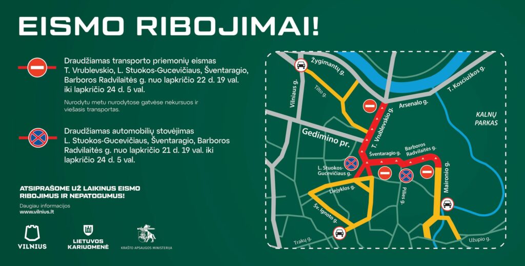 Nuo lapkričio 22 d. 19 val. iki lapkričio 23 d. 24 val. bus draudžiamas transporto priemonių eismas T. Vrublevskio, Šventaragio, Barboros Radvilaitės ir L. Stuokos-Gucevičiaus gatvėse.