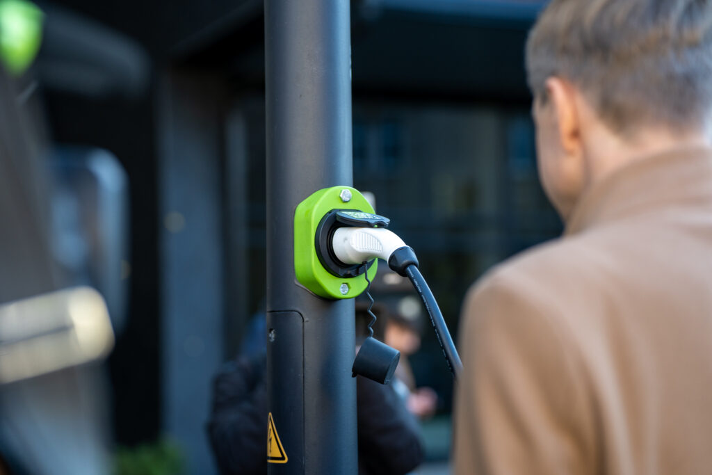 - Įkiškite krovimo kabelį į elektromobilio elektros lizdą, tuomet – į įkrovimo stotelę;